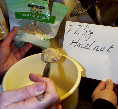 ハーゼルナッツを125グラム入れます。日本ではなんと呼ぶのかわかりません。辞書を見るとHasel=ハシバミとなっています。