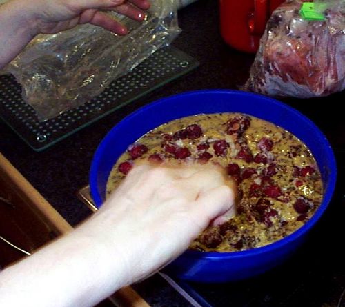 今回はオーブンに入れる直前に、サクランボを入れてかき回しました。表面にも彩りも考えて、手で置いていきます。