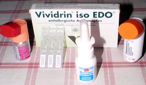 わたしの対アレルギー作戦。左からスプレー"Flutide*N 125", 目薬"Vividrin iso EDO"の箱と中身の点滴カプセル, 塩水鼻シャワー, スプレー"Allergospasmin*N"。