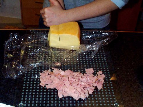 ハムを賽の目に切り、ゴーダチーズを100g切ります。