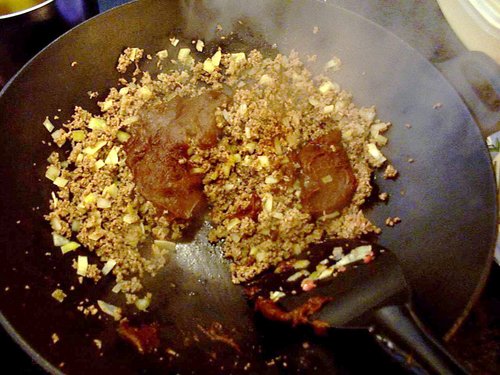 市販のインスタントカレーをお湯に溶き、ケチャップ、トンカツソース、しょう油を加えて作ったペーストを使った。