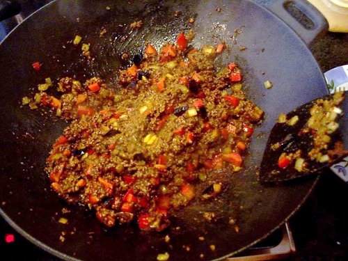 最後にピーマンと、揚げた茄子を加えて炒める。ピーマンはたまたま冷蔵庫に入っていた赤いものを使った。