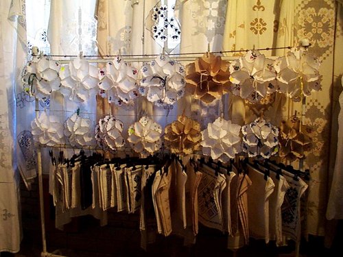 2階には、刺繍されたテーブルクロス、カーテンなどのお店も多かった。真ん中の花のようなものはゆで玉子を入れて食卓を飾るものらしい。