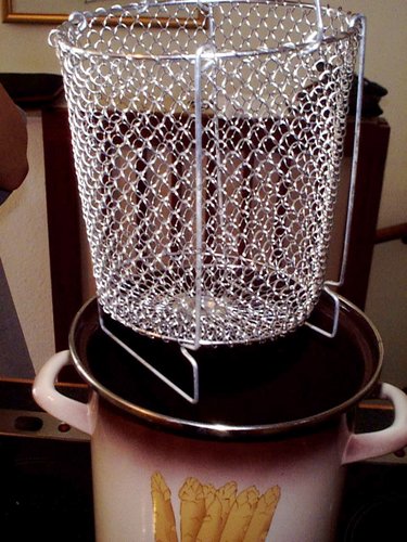 そのザルを引き上げたところ。本来ならば、これにアスパラガスが箸立ての箸のような形で入っています。