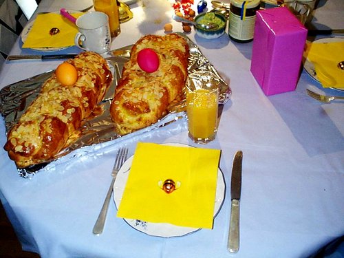 食卓部分1。今朝焼いたOsterzopf の上に彩色した卵をデコレーション。手前の皿の上には幸運の印のテントウムシのチョコレート。