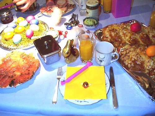 食卓部分2。先ほど切り分けた鮭の薄切り。彩色された卵は真ん中の皿に。チョコレートのウサギも復活祭時のデコレーションのひとつです。