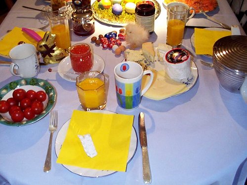 食卓部分3。真ん中のひよこと小さなチョコレートの卵もデコレーションです。その手前はプチトマト、鮭の卵、数種類のチーズ。