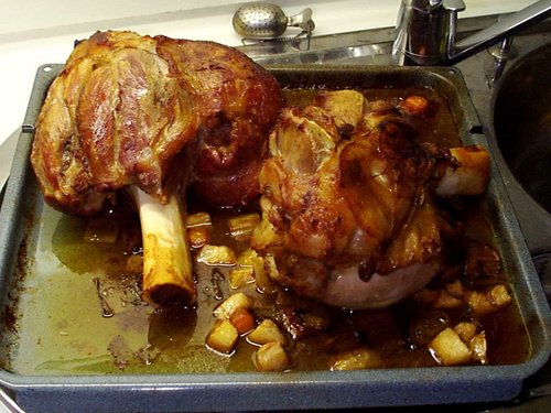 料理法は訊くのを忘れましたが、オーブンに入れて3〜4時間は掛かるそうです。リンゴやニンジン、その他の野菜を一緒に入れておいて、肉汁とそれらの野菜がおいしいソースになるのだろうと思います。今日は9人という事で二本でした。