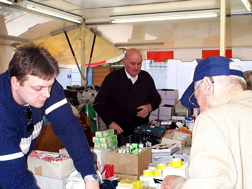 真ん中の頭の禿げたおじさんが有名な "billiger Jakob" 。夕方になるとこの店は超満員になり、おじさんの素晴らしいたたき売りの口上が聞かれます。