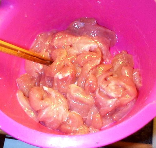トリ肉に塩をひとつまみ入れ、卵の白身と片栗粉、それに水を少々加えてよく混ぜる。