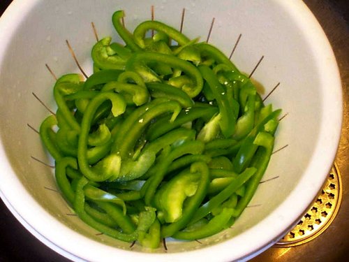 約1センチ幅に切ったピーマンに熱湯をかけて少ししんなりとさせました。