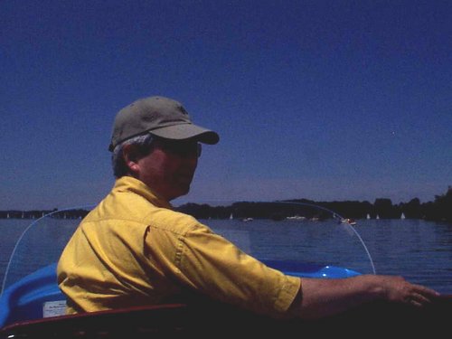 電動ボートの運転中。波もなく湖に浮いているヨットの数も少なかったので、ぶつかる危険もないので、のんびり運転しました。