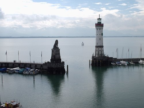 Lindau の港。右が灯台。左がバイエルン州の象徴であるライオンの像で、この町がドイツ領であることを示しています。