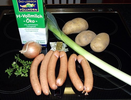 上段左から時計回りに、牛乳、長ネギ、ジャガイモ、ソーセージ、ハーブ(Kerbel)、玉ねぎ、真ん中は野菜スープの素。