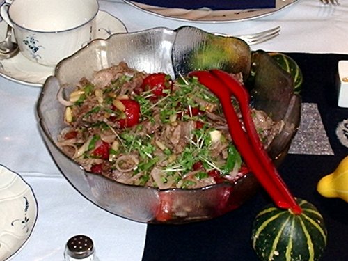 牛肉の薄切りを使ったサラダ。プチトマトは昨夜わたしが一個一個、湯むきをしました。単純であまり面白くもない作業です。(^_^;)
