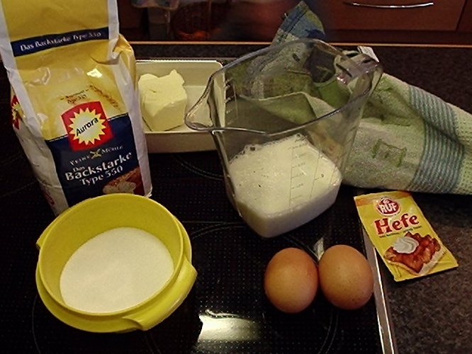 材料です。上段左から時計回りに小麦粉、バター、牛乳、酵母、卵、砂糖。