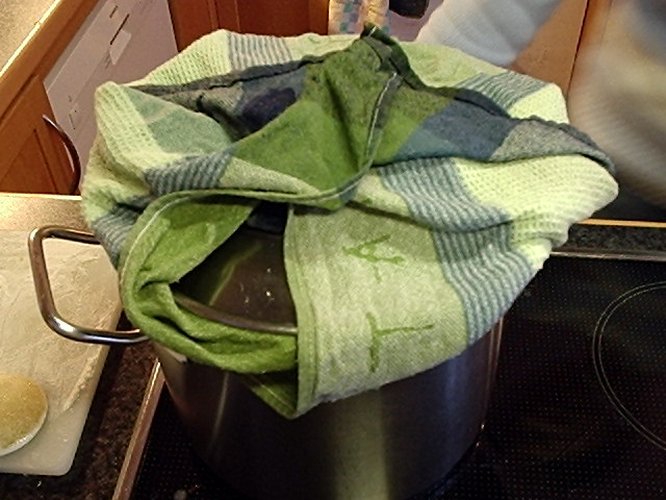 濡れ布巾の上からキッチリと蓋をして、隙間のないようにします。このままの状態で、かなりの弱火で約30分間煮ます。
