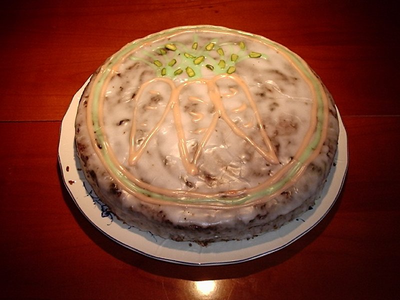 カローラがブリギッテのために昨夜焼いたケーキ。緑の葉の部分はピスターチェの実をつぶしたものでニンジンの黄色はオレンジの絞り汁を使ったそうな。けっこう自慢の品でした。