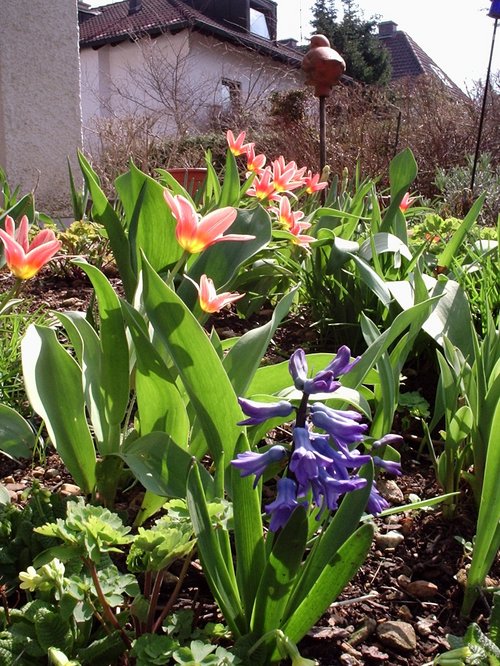 明るい春の光の中、チューリップも誇らしげに咲き始めました。