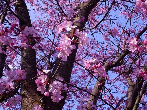 色がかなり濃くて山桜のような感じ。青い空をバックに嬉しそうに咲いています。