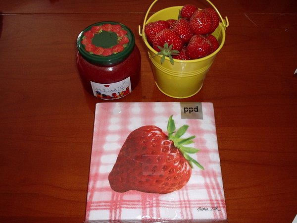 出来たてのイチゴジャムを瓶詰めにして手書きのラベルを貼ったもの。隣は小さなバケツに摘み立てのイチゴを入れたもの。手前はイチゴ模様の紙ナプキンと、イチゴづくしのプレゼント。(^_^)