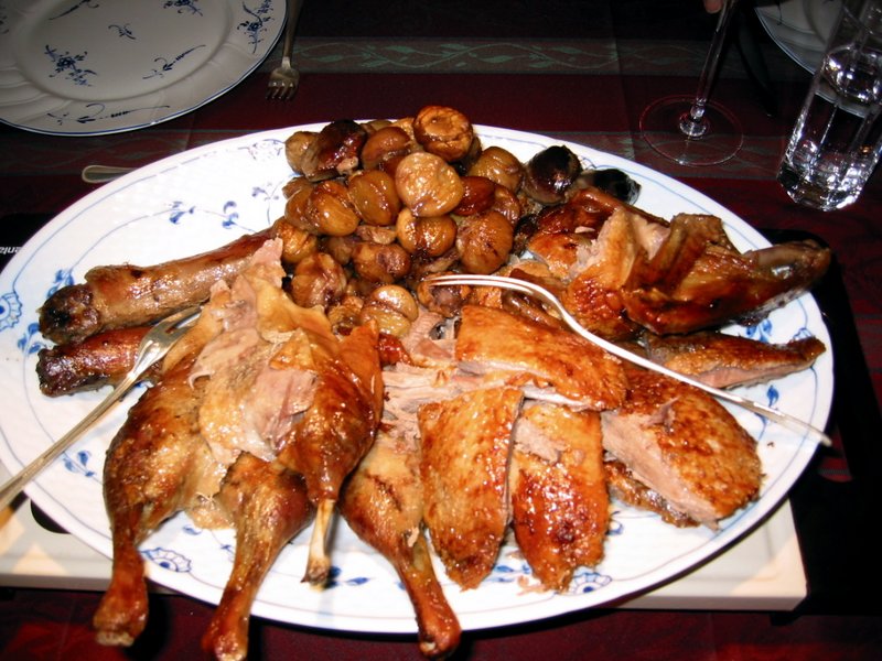切り分けて大皿に盛りつけられた鴨と栗。