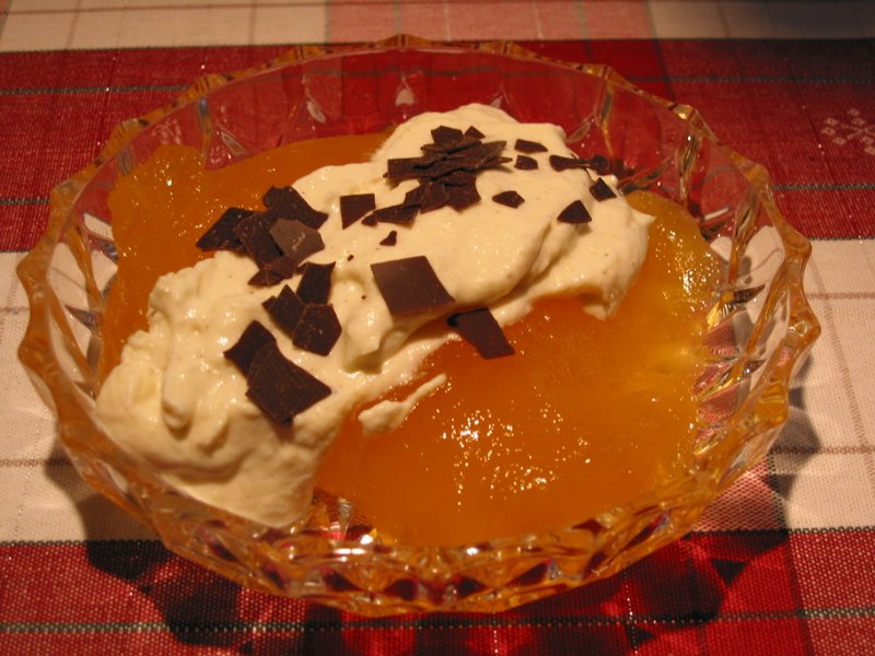 デザートには、オレンジゼリーにココナッツクリームの組み合わせに薄いチョコレートをかけたもの。 "Orangen-Zitronen-Gelee mit Kokoscreme"