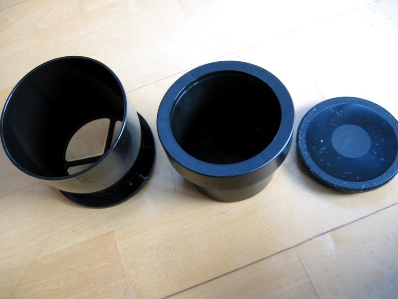 この3つからなっている。左はフィルタ、真ん中は底に小さな穴がいくつか開いて、上からお湯を注ぐとコーヒーの粉に均等に降りそそぐ。右は蓋。