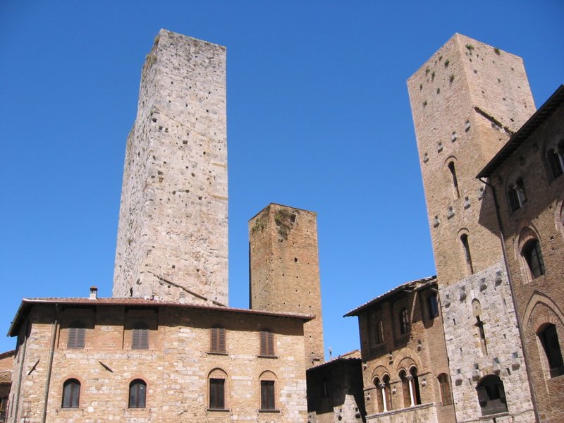 今に残る10数本の塔が売り物の中世の街。素晴らしい青空だった。