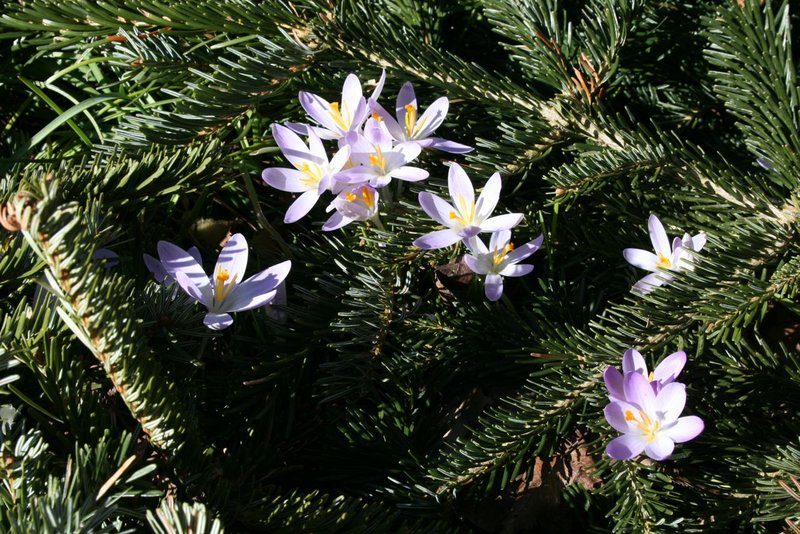 霜よけにかぶせた樅の枝の間から顔を出したクロッカス。