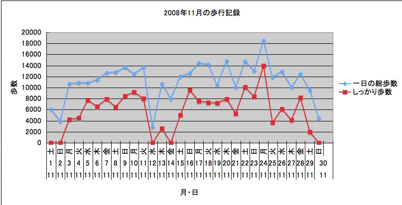 12日は雨が降って歩けなかったのが折れ線グラフでもわかる。それと、やはり休日には歩数がガクンと落ちるようだ。