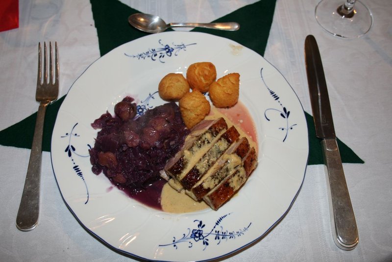カモの胸肉、栗入り赤キャベツ、ジャガイモのコロッケ