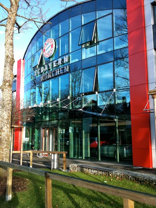 帰り道の途中にあるサッカー名門クラブ FC Bayern München のクラブハウス。いつの間にか、こんな立派な玄関になっていた。今日は公開練習があるとかの立て札が出ていた。